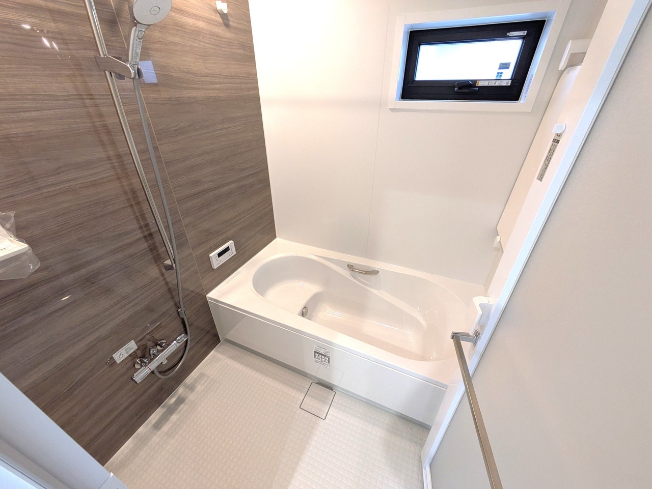 【施工例】手入れがしやすく清潔感・保温効果もある人工大理石の浴槽。梅雨や冬場に活躍する暖房換気乾燥機や手すりなども装備付き。 ※壁面はマグネット対応でサッと取付・掃除も楽々。