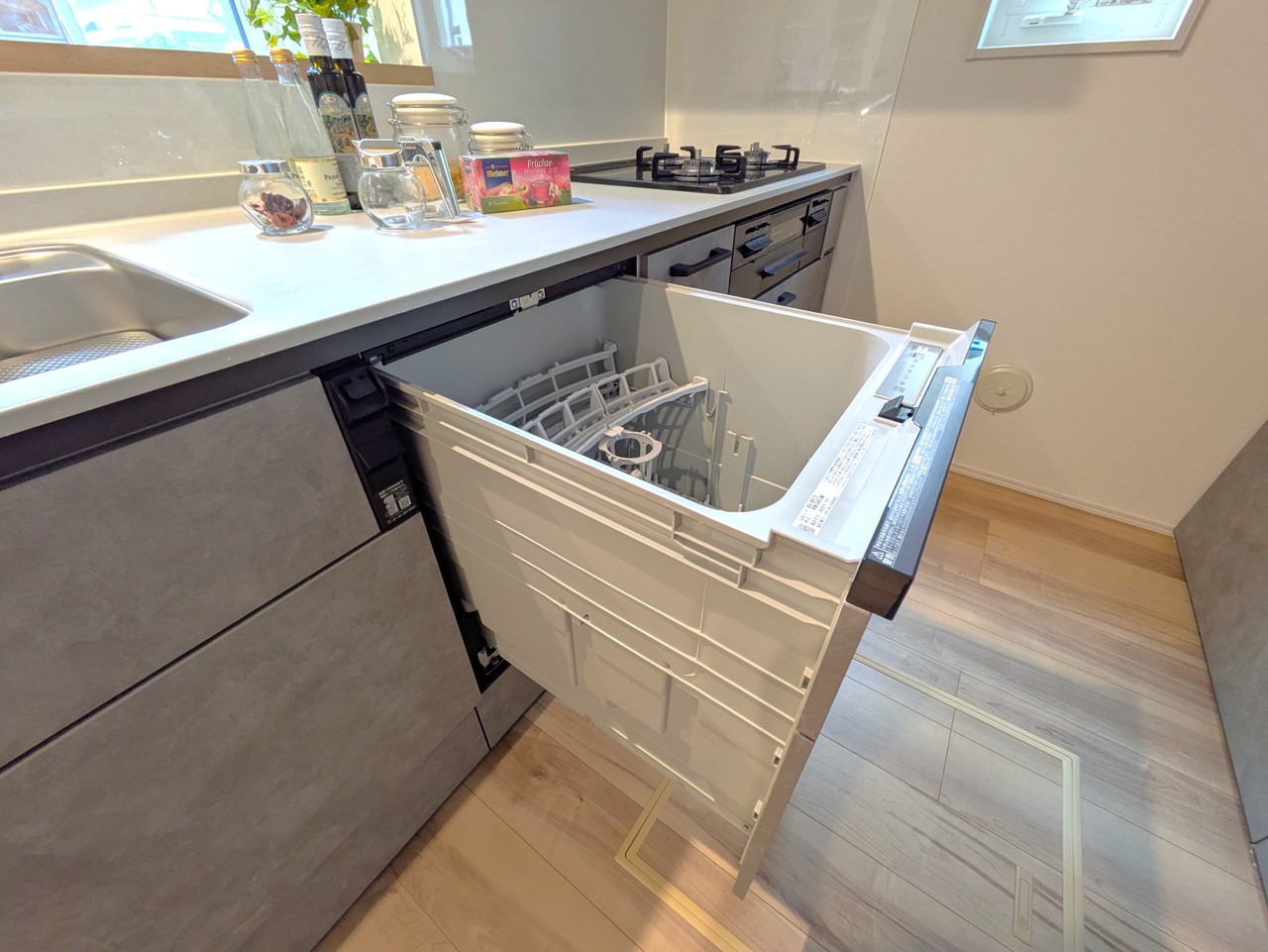 深型タイプで使い勝手のよい「食器洗い乾燥機」付。他にも調理の際に便利なクッキングコンセントから、掃除も楽々ガラストップコンロ、浄水機能付きの水栓など、家事の負担をサポートする充実の仕様のキッチンです。