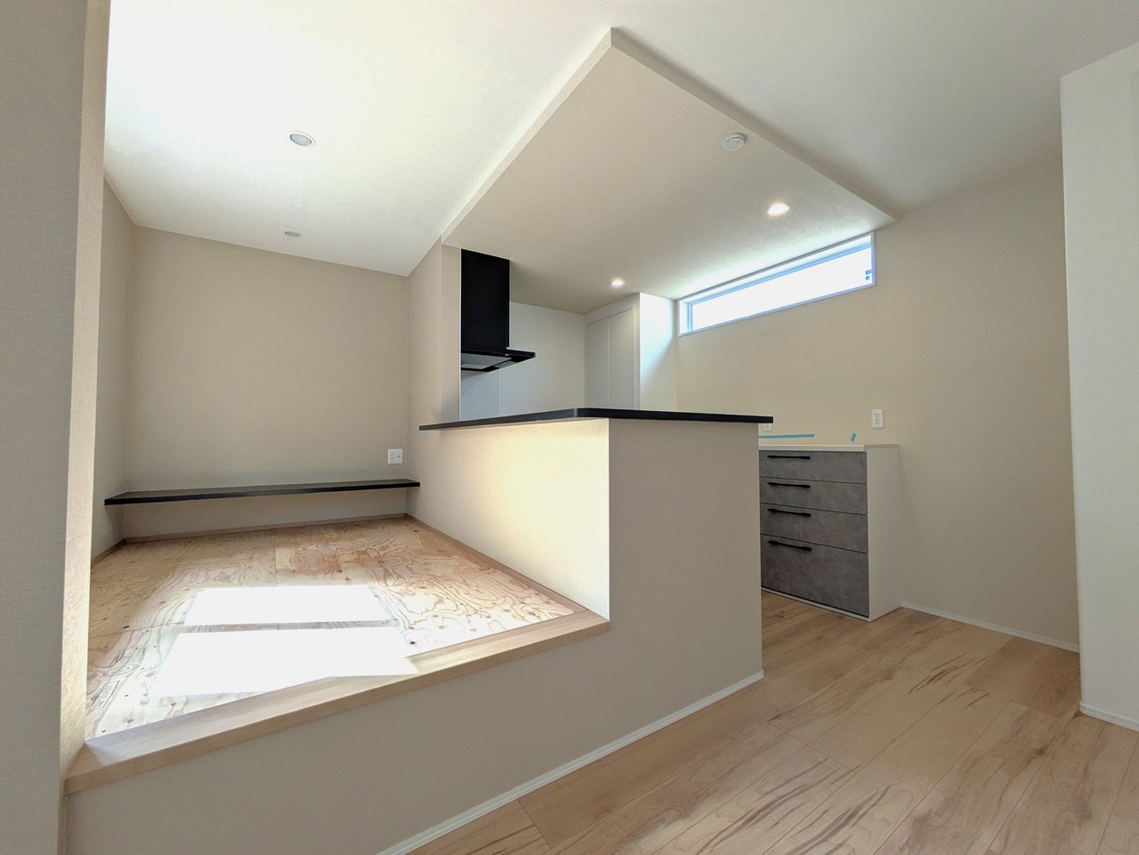 【施工例】キッチン前には、ちょっと横になってお昼寝をしたり、時にはワークスペースとして使えるよう専用棚を設置した窓からはお庭を見渡せる小上り和室がございます。