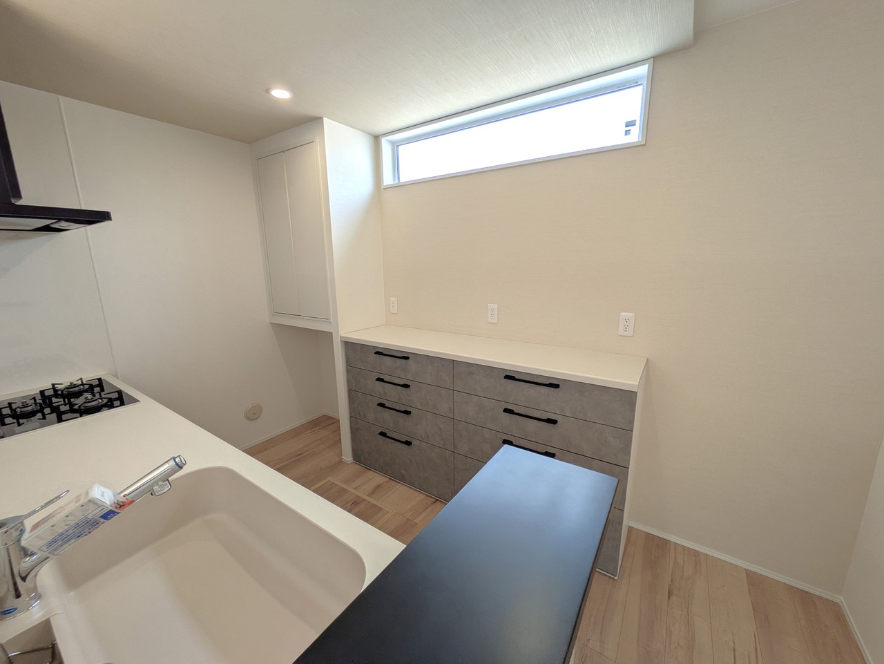 キッチンは深型食洗機、ガラストップコンロ、ソフトクローズ機能のスライドキャビネット、整流板付きレンジフード、など毎日の家事の負担を軽減する充実設備をご用意しております。背面にはカップボード食器棚付き。