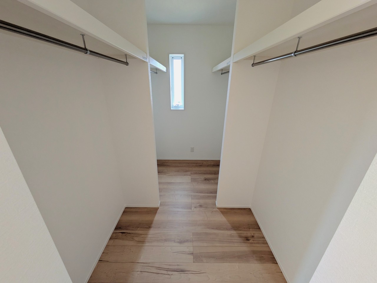 2階8帖の主寝室には、大容量収納のWICがございます。向かい合ったハンガーパイプとなっておりますので、御夫婦で使い分けが可能です。