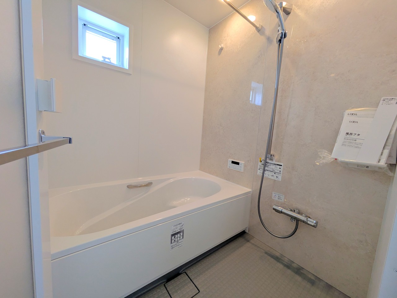 手入れがしやすく保温効果も高い人工大理石の浴槽が標準仕様の浴室。梅雨や冬場に活躍する暖房換気乾燥機や手すり付き。 壁面はマグネット対応で、お好みで鏡や棚が付けられるようになっており、お掃除も楽になります。