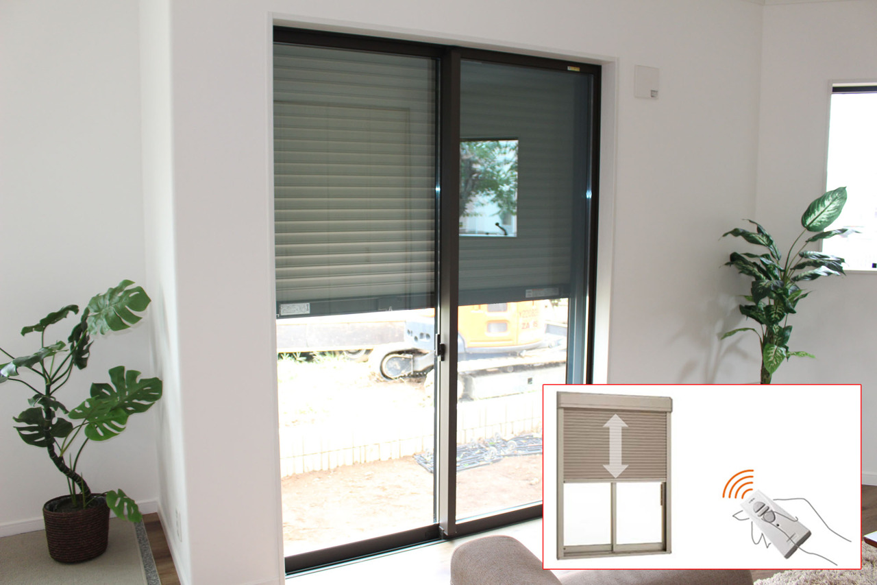 1階の主窓には電動シャッターが付いております。窓は樹脂複合サッシで結露もしにくいエコLow-Eガラス、アルゴンガス入りで高断熱です。1階の小窓はさらにセキュリティ膜付きの防犯用で安心!