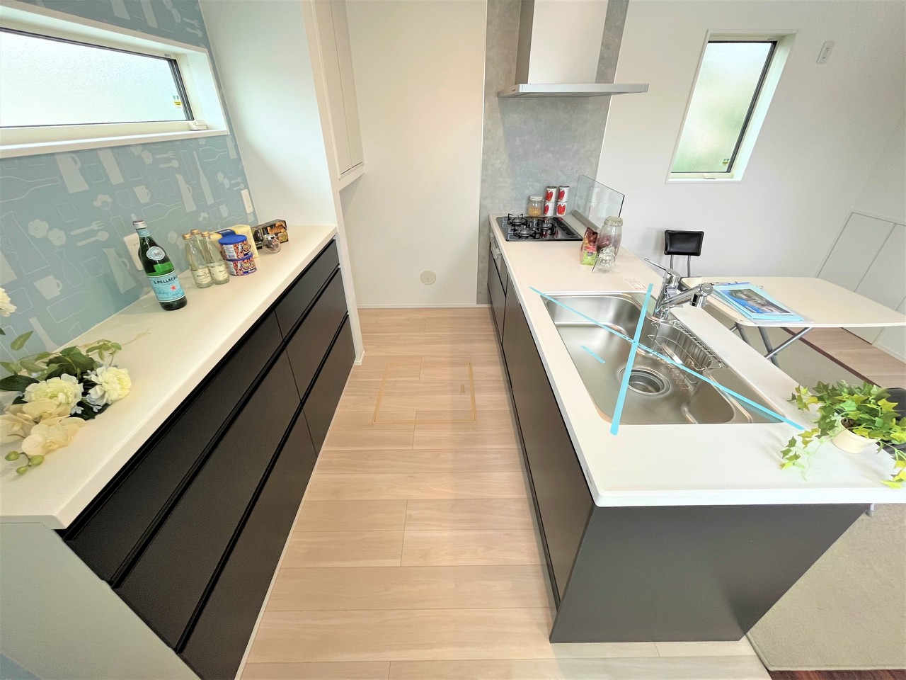 キッチンは食洗機、ガラストップコンロ、ソフトクローズ機能のスライドキャビネット、整流板付きレンジフード、など充実設備が付いております。なんとカップボード食器棚まで。