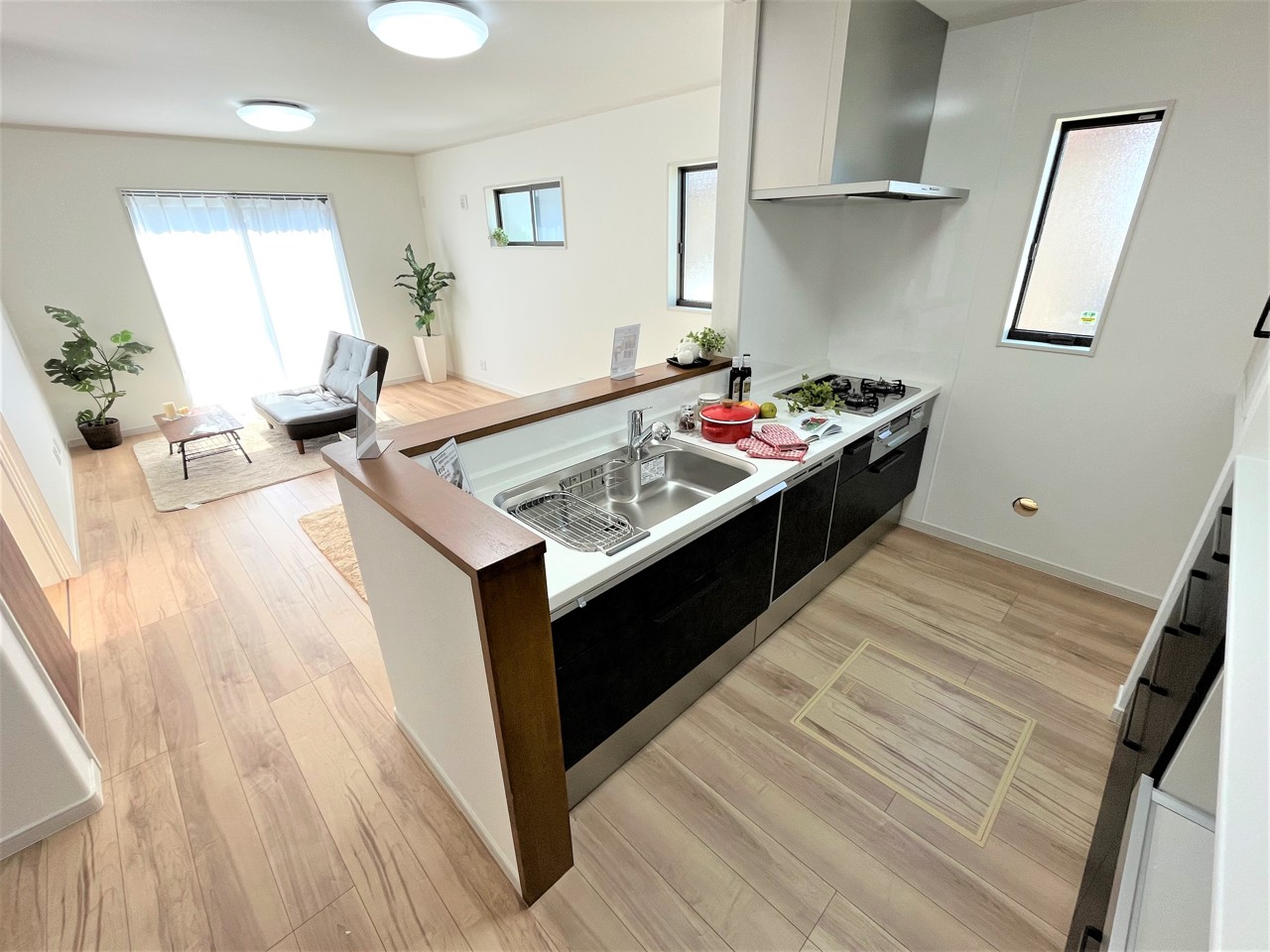 ZEH基準相当の断熱性、省エネ性能を持ち、食洗機、カップボード食器棚、電動シャッター、豊富な収納、などなど、充実の建物仕様をご用意しております。